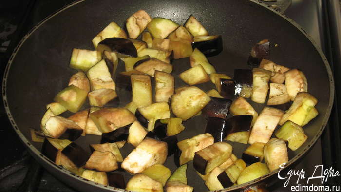 Порезать 1 баклажан кубиками и обжарить на сильном огне с небольшим количеством оливкового масла.