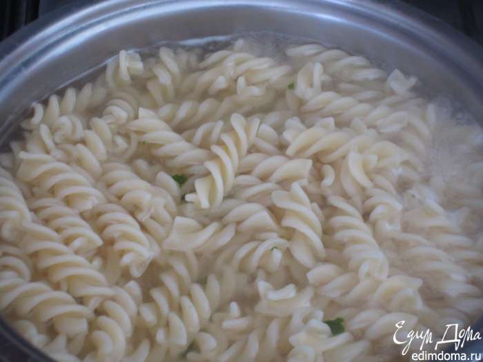 Пасту отварить в подсоленной воде согласно инструкции на упаковке (у меня 10 минут).Оставить 1 чашку воды от варки пасты для соуса, пасту откинуть на дуршлаг, дать стечь.