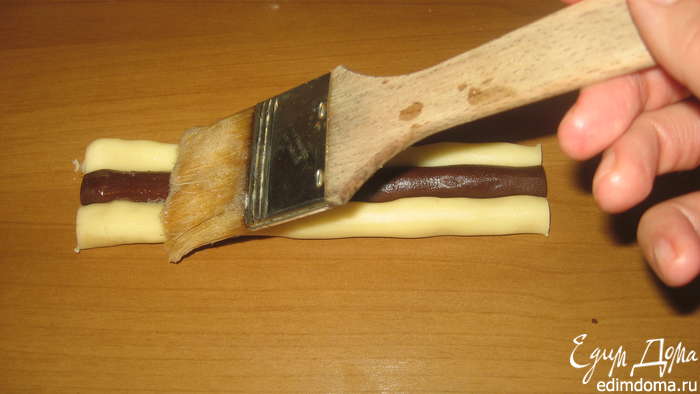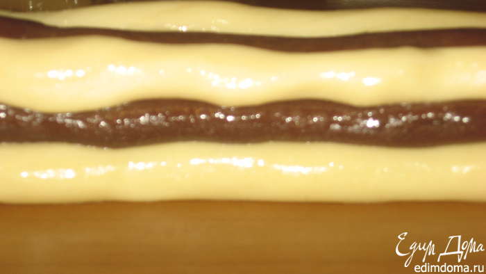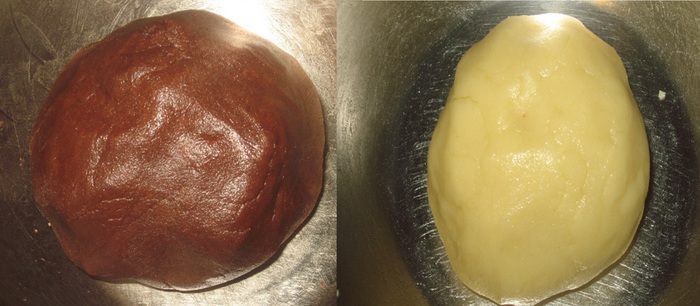 Замесить тесто и разделить на две части. В одну из них добавить какао-порошок. Обернуть тесто целлофановой пленкой и поместить в холодильник на 30 мин.