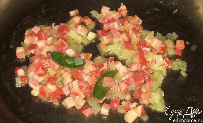 Добавить бекон,шалфей и обжарить на сильном огне минуту,влить вино и готовить до выпаривания алкоголя.