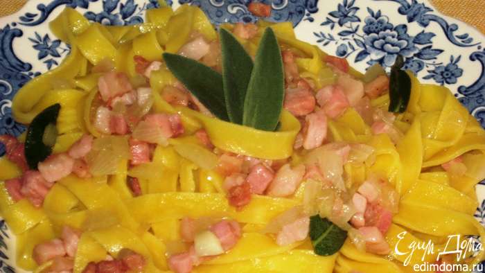 Поместить тальятелле к бекону,влить воду от варки пасты,хорошо перемешать и прогреть нa огне 3-4 минуты.