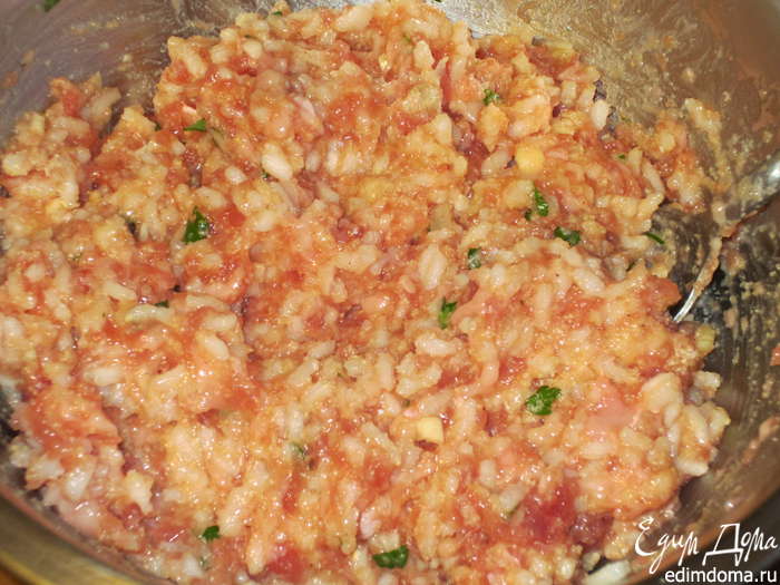Добавить желтки,посолить,поперчить и приправить перцем чили. Добавить рис и панировочные сухари (добавить столько,чтобы из приготовленного фарша можно было сформировать шарики).Хорошо перемешать.