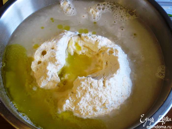 Раскатать 3-й шар теста (190 г), слегка растянуть руками и выложить на начинку, прижать к бортикам. Смазать поверхность оливковым маслом.