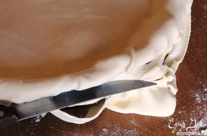 На присыпанном мукой столе очень тонко раскатать один шарик теста (300 г), затем осторожно растянуть его руками.
