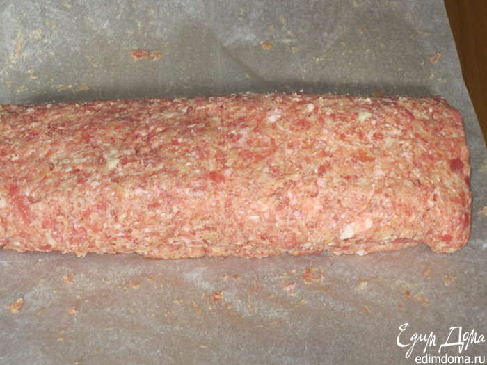 Выложить рулет на противень с пергаментом и выпекать в разогретой до 200°С духовке 45- 50 минут.