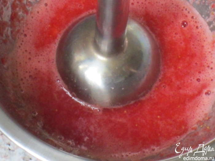 Желатин(2 пластинки) залить холодной водой и оставить на 5 минут.Клубнику и 40 г сахара пюрировать погружным блендером.