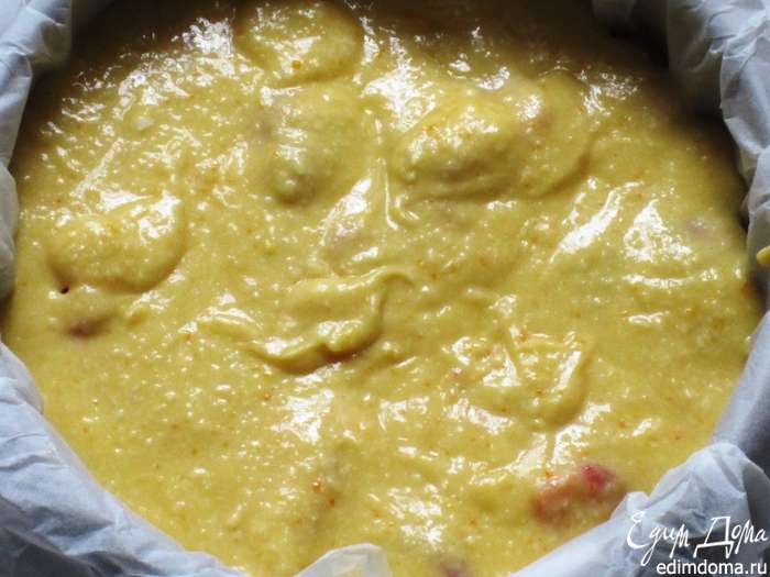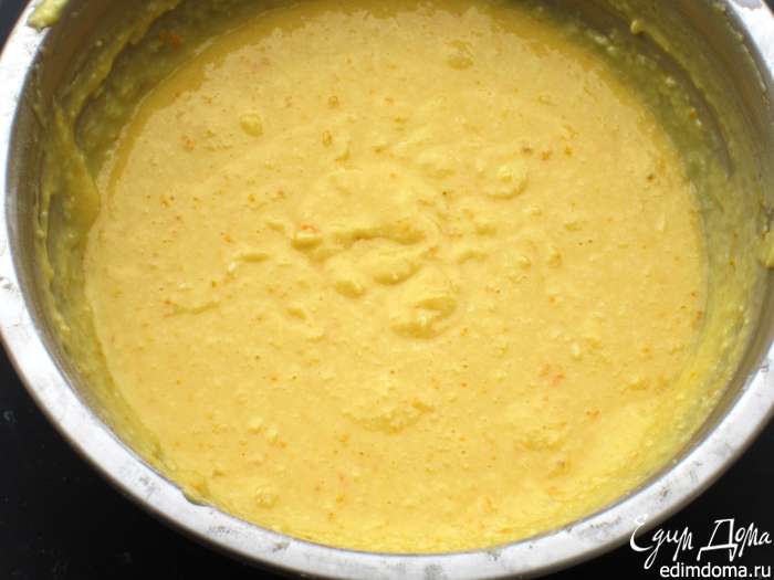 Продолжая взбивать, добавить яйца, по одному. Молоко влить тонкой струйкой, в несколько приёмов ввести муку, просеянную с разрыхлителем, добавить цедру и все хорошо перемешать деревянной ложкой.