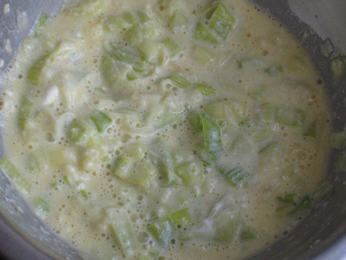 Соединить лук-порей,рикотту,тёртый пармезан,мускатный орех,белый перец, яичные желтки и хорошо перемешать.