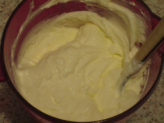 Выложить тесто в разъёмную форму диаметром 20-22 см (у меня была форма диаметром 20 см и я с помощью пергамента сделала высокий бортик,чтобы поместился весь крем),разровнять и выпекать в разогретой до 150° С духовке 30 минут.Остудить бисквит не вынимая из формы.