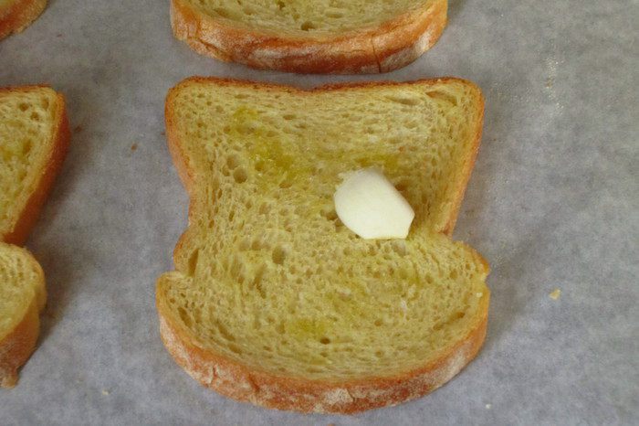 Ломтики хлеба сбрызнуть оливковым маслом, выложить на противень с пергаментом и запечь в разогретой до 180 С духовке 6 минут.